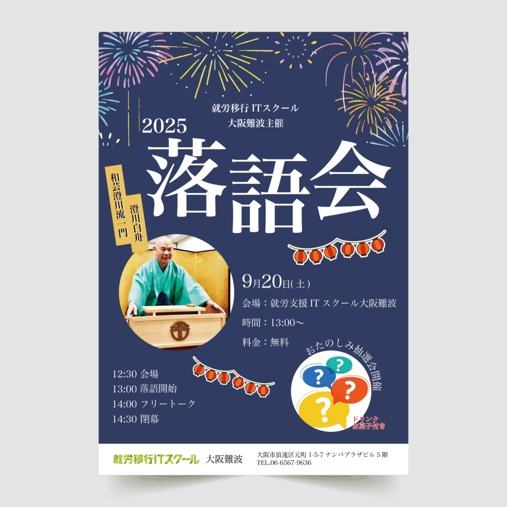 落語会のチラシ作成ですが落語っぽくないチラシが好みということで夏祭りをイメージして作成しましたチラシ全体にあしらいを入れて楽しい雰囲気でまとめました
