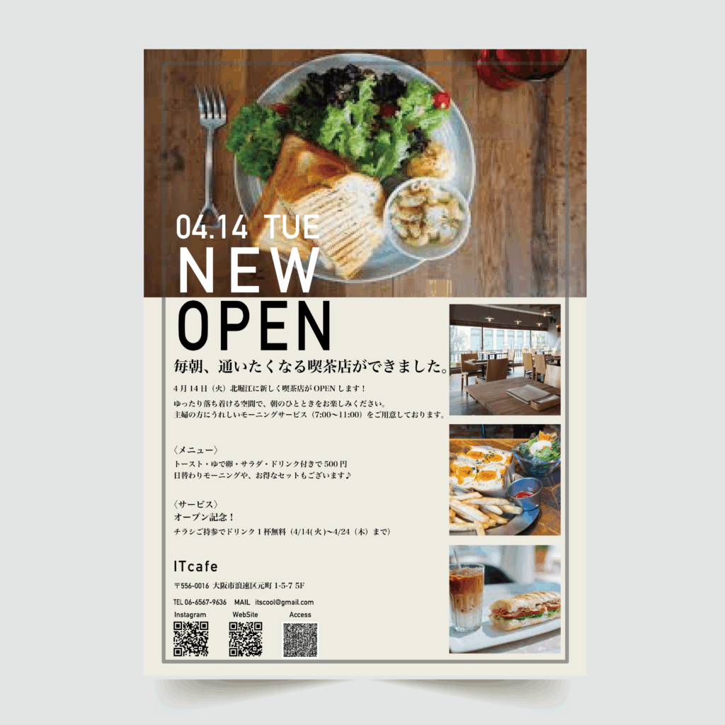 カフェのチラシ作成の課題で場所が北堀江という場所もありスタイリッシュになるように配色を考えました、温かい雰囲気もわかるように茶色とクリーム色を使って作成しました